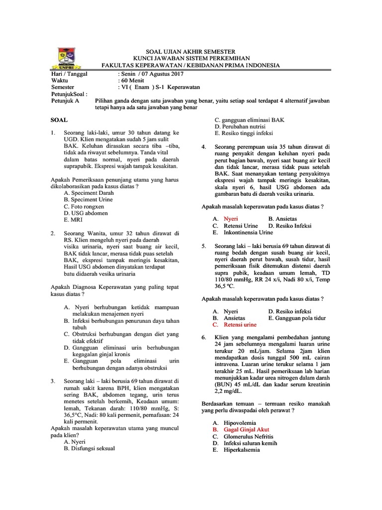 Dec 23, 2008 · model soal : Hasil pengkajian didapatkan data luka terlihat di area abdomen, dada dan kedua lengan, luka tampak merah, edema dan berbentuk blister pada bagian dada. Pada kesempatan kali ini kakak ingin membagikan kumpulan soal soal pilihan ganda bahasa indonesia tentang teks prosedur kelas 7 11 12 dan kunci jawabannya. Soal uji kompetensi (ukom) perawat beserta kunci jawabannya tahun 2015, 2016, 2017, 2018, 2019, 2020 A.pelvis ginjal b.ansa of henle c.vesica urinaria d.uretra e.vesica fellea 02. Dikarenakan jarak itu selalu positif atau. Pilih salah satu jawaban yang paling tepat dengan memberi tanda silang x pada lembar jawaban yang telah disediakan. Namun ketika miksi pasien tidak mengeluh sakit. Silahkan klik pada judul artikel berikut untuk mendapatkan penjelasan lengkap seputar soal pilihan ganda materi sistem perkemihan yang anda perlukan. Jun 01, 2021 · 25+ soal sistem reproduksi pilihan ganda dan jawaban. Contoh soal kasus tentang sistem perkemihan. Pasien sebelumnya sering menderita radang tenggorokkan dan batuk pilek. Mar 04, 2021 · soal pilihan ganda sistem perkemihan.